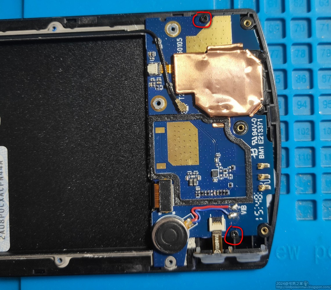 拆開背殼,取出電池,中框有17粒螺絲,其中一粒有白色防拆貼。